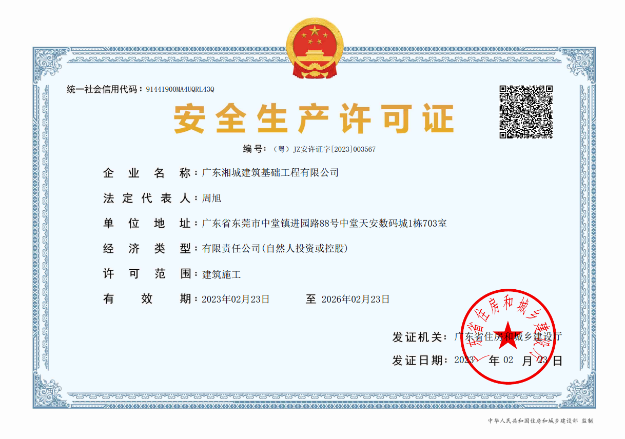 廣東湘城建筑基礎工程有限公司,成立于2016年,注冊資金4888萬元,持有地基基礎工程專業承包壹級資質,具有安全生產許可證??沙薪痈鞣N基礎類施工,包括各類樁基礎、基坑支護、邊坡支護、地基強夯處理等施工業務。公司為地基與基礎工程專業承包、工程施工、技術咨詢、技術開發、技術服務、信息咨詢實體型企業。